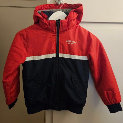 Vinterjakke i sort farve med hætte. Jakken har en lynlås fortil og er designet med flere lommer, en med en orange lynlås. Den har ribstrikkede manchetter for at holde på varmen.