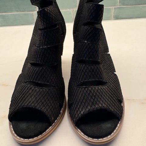 Et par brugte, to-remmede glitter sandaler med justerbare spænder. De har en kork mellemsål og en sort ydersål med rillede mønstre for at øge trækkraften.