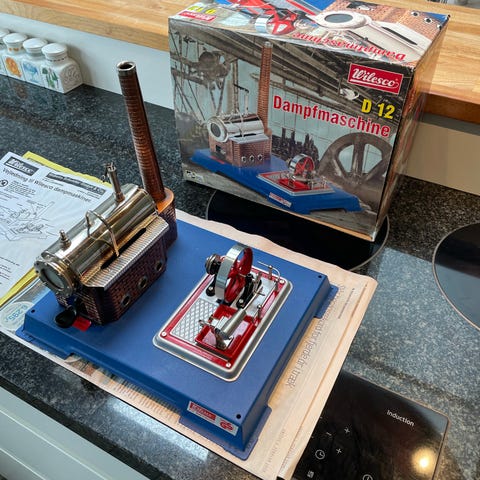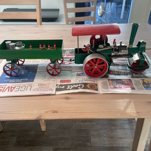 Velholdt ældre Tysk Wilesco D8 dampmaskine, god begynder model, sælges med brugsanvisning, sprittabletter, dampolie og tragt for 450kr PS. Har den også i den tidlige udgave med grå grundplade og svinghjul med 6 eger hvor de senere har 5 eger, se foto 6-7-8