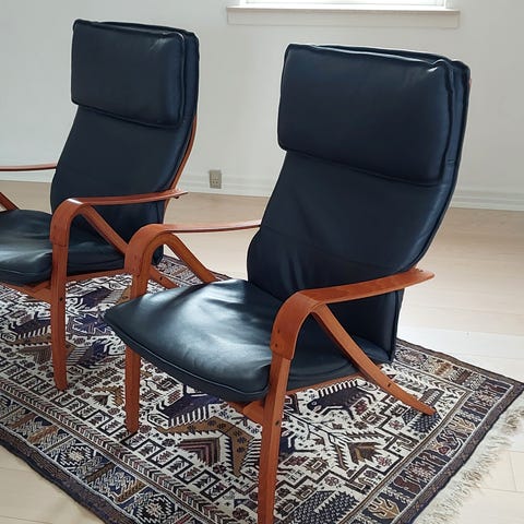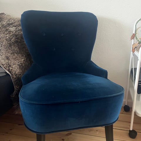 IKEA Rimbo-lænestol med sortlakeret træstel og blå polstring. Den er designet af Simo Heikkilä og blev solgt af Ikea i 1990'erne. Stolen har buede armlæn og høj ryg med aftagelig og vaskbar hynde . Polstringen er af stof, og stellet er i formspændt træ. Stolen er behagelig at sidde i. Den er velegnet som læse- eller hvilestol i stue eller opholdsrum.