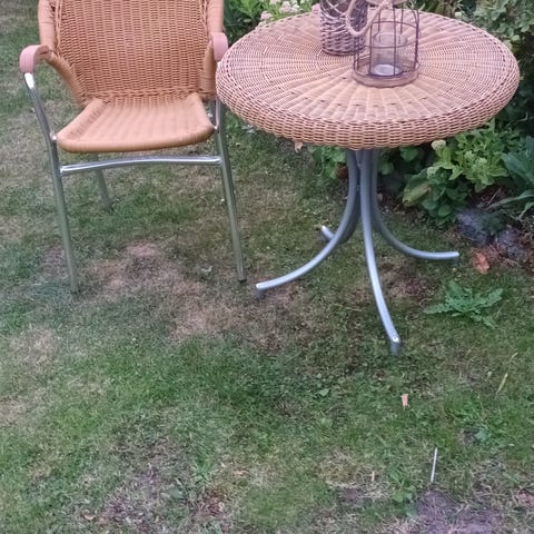 Havecafé sæt med bord og 2 stole i træ og metal. Bord og stole har lameller i lyst træ og sort metalstel. Stolesæderne kan bruges med eller uden løse, polstrede hynder i lys farve. Sættet er egnet til altan, terrasse eller lille udendørs spiseplads.