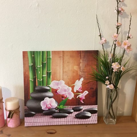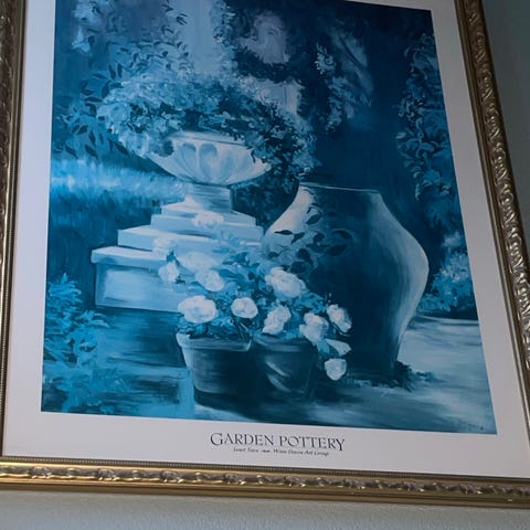 Magnolie 1 stk Kønt billede i blå rosa toner m. romantisk magnolie digt. Monteret på træramme (giver en god fremhævet effekt) bagside m. hul ophæng.