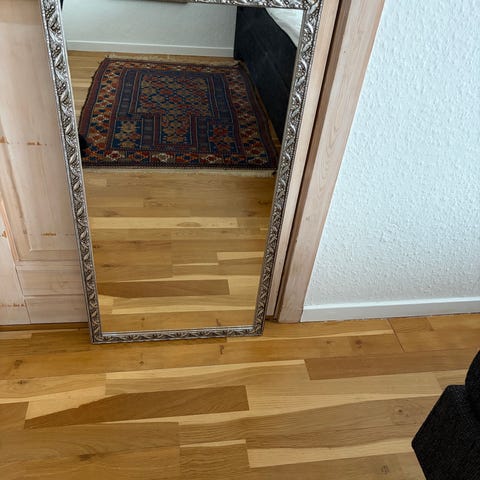 Spejl med rektangulær form og sølvfarvet ramme. Spejlet har en bred ramme.
