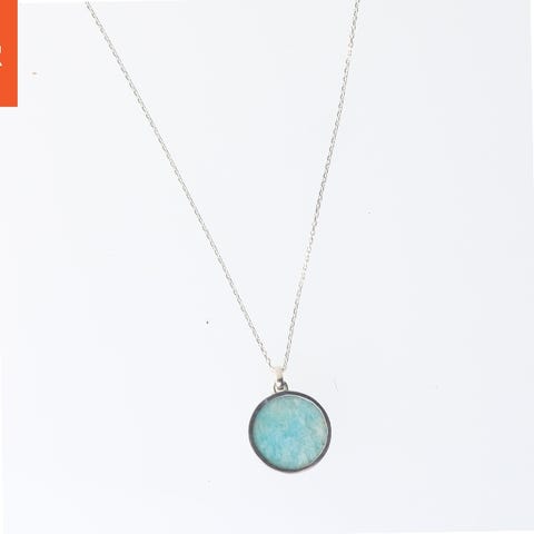Objektet på billederne er en kæde med et blåfarvet vedhæng. Vedhænget er formet som en spids stav og ser ud til at være lavet af glas eller krystal, fastgjort til en kæde. Kæden er lavet af sølvfarvet metal og har et klassisk kædedesign med små led. Vedhænget er fastgjort med en dekorativ holder, der giver et unikt udseende. Den samlede længde af kæden er 74 cm.