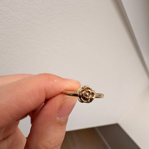 Denne guldring er udsmykket med tre blomster, hver med en centreret sten, der giver et elegant og fornemt udseende. Blomsterne er hvide, hvilket kontrasterer smukt mod den gyldne ring. Ringen kommer i en original Christina Jewelry & Watches æske. Størrelsen på ringen er 57 mm. Tagger: ring, guldring, blomsterdesign.