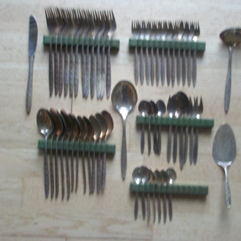 Jeg har i alt 85 dele af Monarkbestikket. Bestikket er ikke slidt. Der er indgravering (initialer) graveret på noget af bestikket