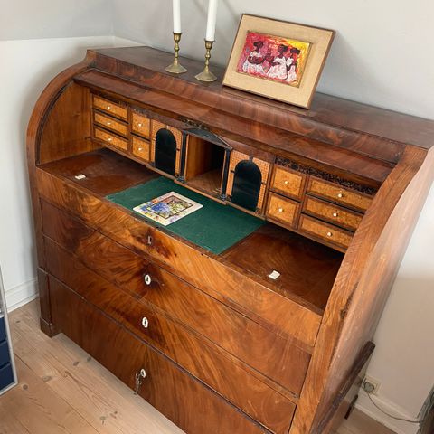 Over skrivepladen er der en række små skuffer og rum til papirer og mindre genstande. Øverst er der et overskab med to låger og hylder indvendigt til glas, porcelæn eller andre ting.