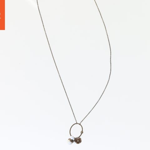 Denne halskæde er 52 cm lang og består af en række perler i varierede farver og størrelser. I midten er der et stort hjerteformet vedhæng, som ser ud til at være en udsmykning lavet af glas eller en lignende sten. Halskæden har forskellige dekorative mellemstykker mellem perlerne. Perlerne er primært grå, sølv og let iriserende i farvetone.