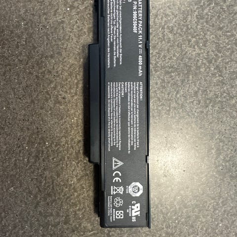 Dette er et sort, genopladeligt batteri til en bærbar computer. Batteriet har dimensionerne 20,5x5 cm. Det har en spænding på 11,1 V og en kapacitet på 4400 mAh. Batteriet er fremstillet i Kina og er af typen Li-ion. Der er advarsels- og sikkerhedsmærkater trykt på den ene side.