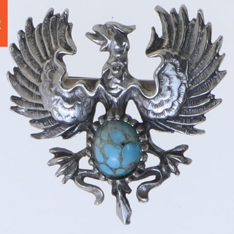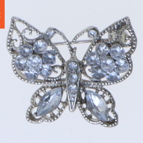 Broche i form af en halvmåne, dekoreret med mange små klare rhinsten. Den er omkring 5 cm i størrelse og har en låsemekanisme på bagsiden til fastgørelse på tøj.