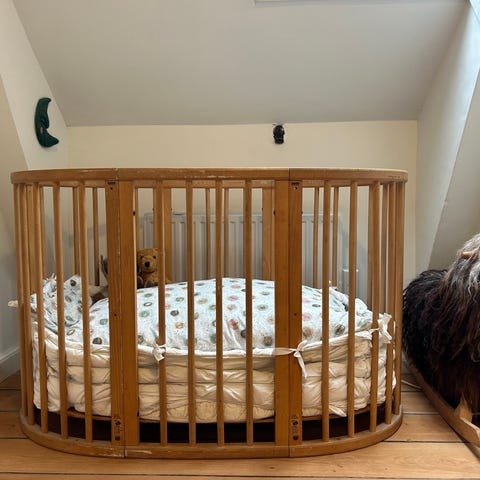 Stokke Sleepy tremmeseng i naturfarvet træ. Sengen fremstår med brugsspor men fungerer som den skal.