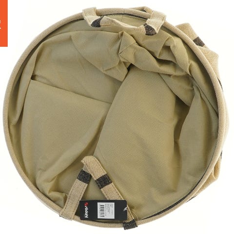 En rund, foldbar opbevaringskurv med en diameter på 40 cm. Kurven har et beige farvet stof med sorte striber og indvendige håndtag. Den er designet til at opbevare og organisere forskellige genstande let og effektivt. Kurven er let og kan nemt foldes sammen for opbevaring, når den ikke er i brug. Den leveres med en etiket fra 'Hopop'.