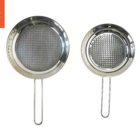 Disse billeder viser to fladnette filtre lavet af rustfrit stål. De har huller til effektiv filtrering og lange metalhåndtag for nem håndtering. Den ene har en diameter på 25 cm, og den anden på 21 cm. Begge har en solid konstruktion og er velegnede til brug i køkkenet.