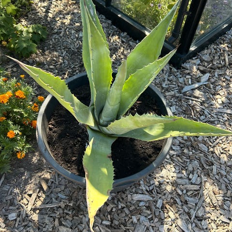 Agave i mellemstørrelse i blå keramikpotte med underskål. Planten har lange, grønne blade. Krukken er glaseret blå med dekorative lodrette riller og neutral kant foroven.