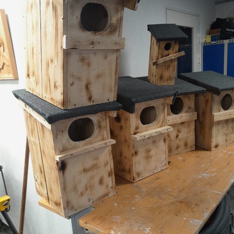 Vi har både ugler og tårnfalke der har haft unger i de her kasser