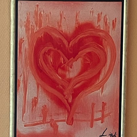 Olie på lærred, indrammet i sortmalet træramme. Lavet af Dagny Bertelsen. Signeret DB. Lærred måler 65 x 45 cm. Rammemål: 69,5 x 49,5 cm. Kan sendes med GLS til en pakkeshop for 79 kroner.