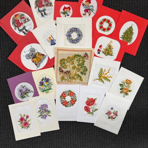 Broderigarn og broderimønstre til korssting med blandede motiver.