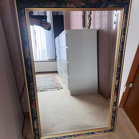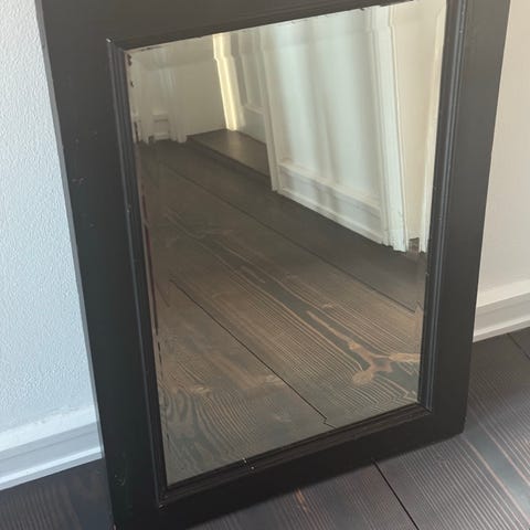 Gammel altertavle i malet træ fra kirke med indsat spejl. Er gået i stykker på det øverste af tavlen.