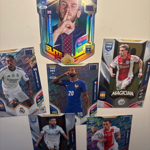 Panini Match Attax fodboldkort samling med blandede hold og spillere fra forskellige klubber og sæsoner. Kortene omfatter blandt andet Real Madrid, Chelsea, Liverpool, Manchester United, Juventus, Atlético Madrid og flere andre klubber. Der ses både standardkort og specialkort med holografisk/foil-effekt samt kort med forskellige temaer som målmand, angriber og midtbane. Velegnet som udvidelse af eksisterende Match Attax samling eller som grundlag for bytte og spil. Antal kort og specifikke årgange fremgår ikke præcist af billederne.