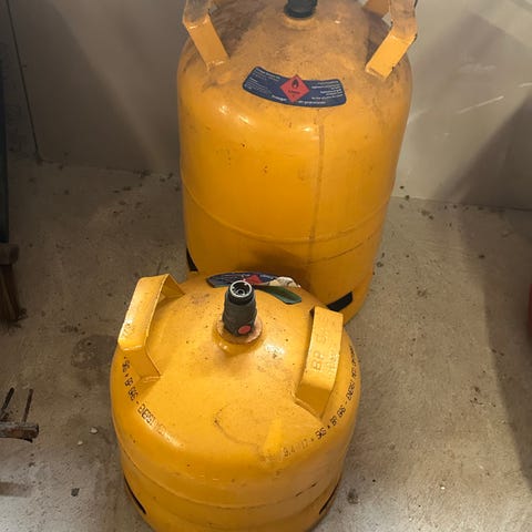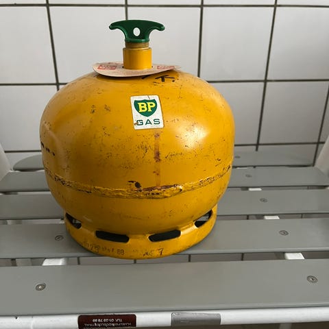 BP gasflaske i metal i gul farve. Egnet til opbevaring af gas til f.eks. grill, campingudstyr eller andre gasapparater, hvor denne type flaske passer til tilslutningen. Flasken fremstår med synlige brugsspor på overfladen.