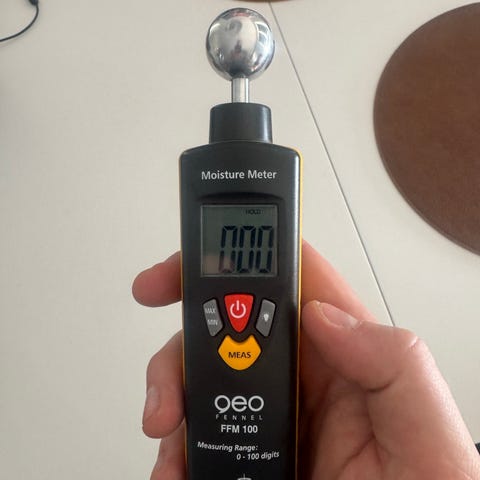 Geo FFM 100 fugtighedsmåler med digitalt display. Håndholdt måleinstrument til bestemmelse af fugtindhold i materialer som gips og cement. Enheden har kugleformet føler i toppen, LCD-display til aflæsning af måleværdier samt betjeningsknapper på fronten. På bagsiden findes tabel med vejledende intervaller for tør, halv-tør og våd for gips og cement. Leveres med original emballage og brugsvejledning.