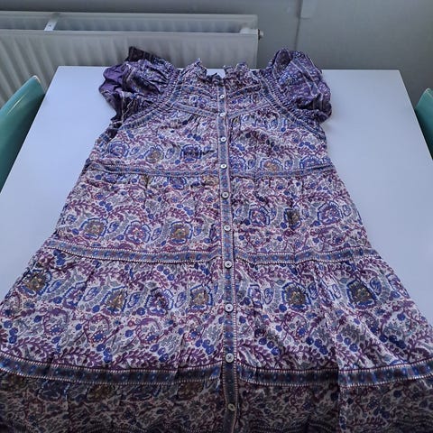 Den er laver i bomuld og viskose - den er meget let i materialet. Har en fin lukning med knapper, som går igen ved ærmerne.