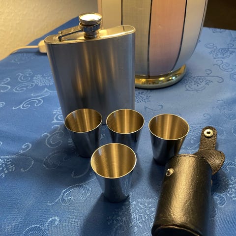 IKEA lommelærkesæt i rustfrit stål. Sættet består af to lommelærker, små drikkebægre samt en tragt til nem påfyldning. Egnet til opbevaring og servering af spiritus eller andre drikke på farten, fx til udflugter eller arrangementer. Neutral, bør ikke bruges til kulsyreholdige drikke. Rengøres i hånden for at bevare overfladen.
