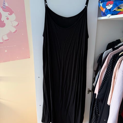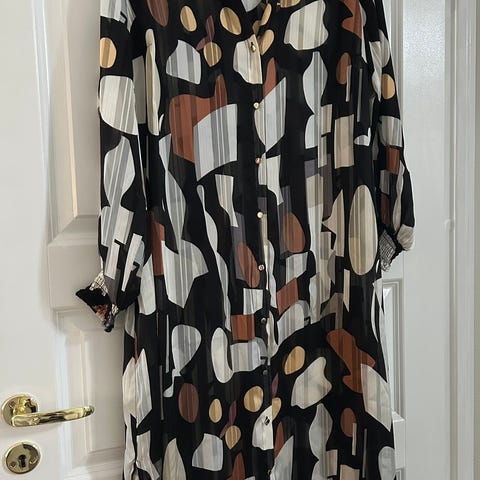 længde fra skulder: ca. 129cm, med 80cm høj slids i højre side. Som ny.