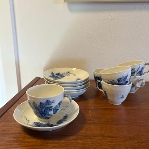 Royal Copenhagen blå blomst mokkakopper med underkopper i porcelæn. Sættet består af kopper og matchende underkopper i hvidt porcelæn med blå dekoration. Velegnet til servering af kaffe eller te. Klassisk stel fra Royal Copenhagen i blå og hvid farvekombination.