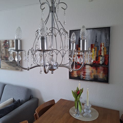 Lysekrone, 5 armet smedjerns lysekrone Rigtig fin som giver et godt lys med sine 5 pærer som er omkranset af glasskåle passer godt over et spisebord