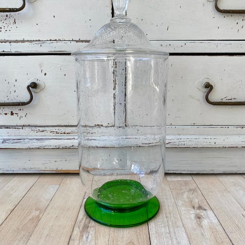 Antik og stort fransk bolcheglas kaldet “pot á bonbon” i mundblæst glas med tilhørende kuppellåg med fin knop. Glasset er fra ca. år 1880-1900. Det smukke cylinderformet opbevaringsglas har tidligere indeholdt forskellige ting såsom bolcher, småkager, marengs og andre søde fristelser.