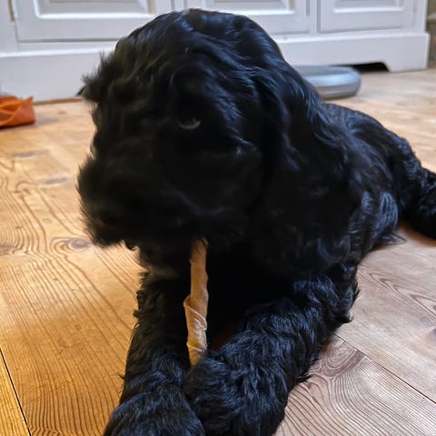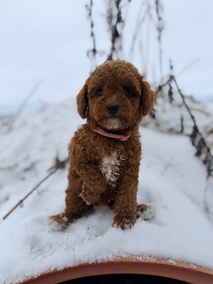 Far er også en lille nuttet fyr, han er en mahogni rød puddel. Han er en rigtig sjove charmetrold, som gerne vil med på tur.