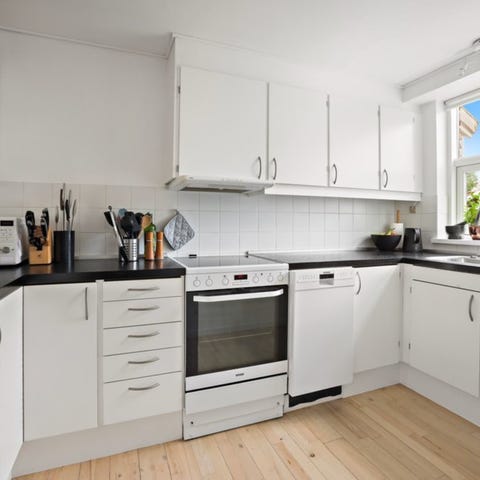 Nedtaget køkken med køleskab med frostkoks, indbygningsovn med kogeplade og opvaskemaskine alt i Bosch. Alt virker fint.