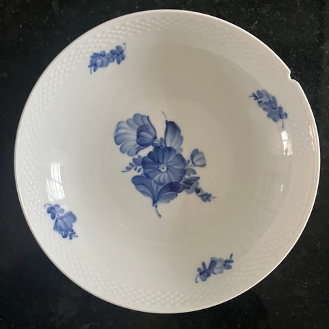 Skålen er i hvid porcelæn med blå blomsterdekoration indvendigt og udvendigt.