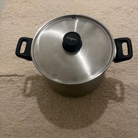 Rådvad gryde med låg i rustfrit stål. Gryden har sort håndtag og sort knop på låget. Velegnet til madlavning af større portioner som supper, gryderetter eller pasta. Kan bruges i køkkenet til daglig madlavning og til tilberedning af retter i én gryde.