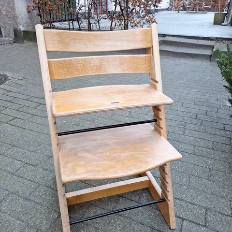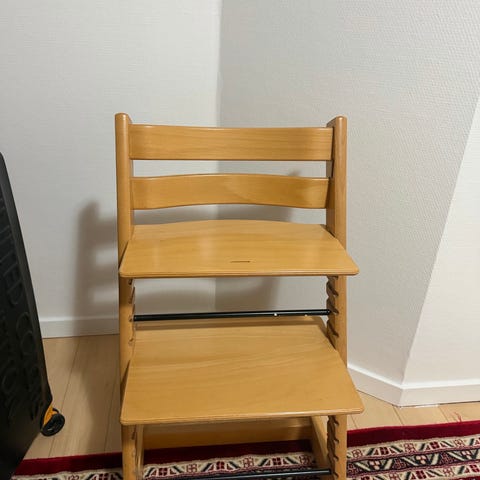 Stokke højstol i træ med justerbar sæde, og fodplade. Designet til børn og kan tilpasses i højden for at følge barnets vækst.