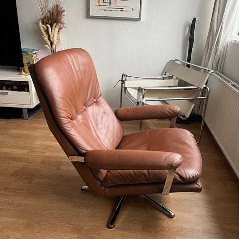 Smuk unik høj kvalitet 100 % håndlavet lænestol med ægtelæder ogteaktær