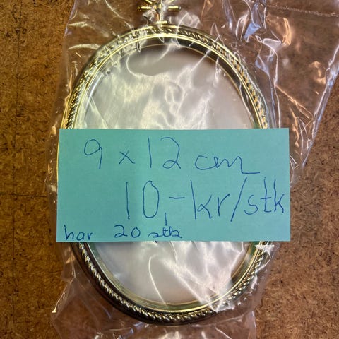 Runde rammer i metal i guldfarve med en diameter på ca. 7 cm. Hver ramme er pakket enkeltvis i plast. Velegnet som ophæng til mindre genstande.