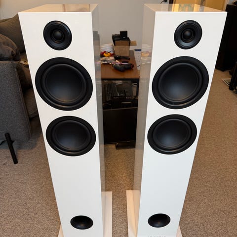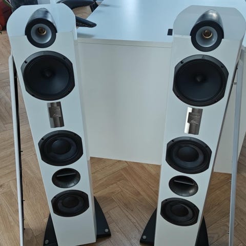Triangle Magellan Duetto i hvid. Står i god stand med mindre skrammer, teknisk perfekt stand. Ca. 6 år gamle. En stor reol/stander højttaler med enorm lyd. :-)