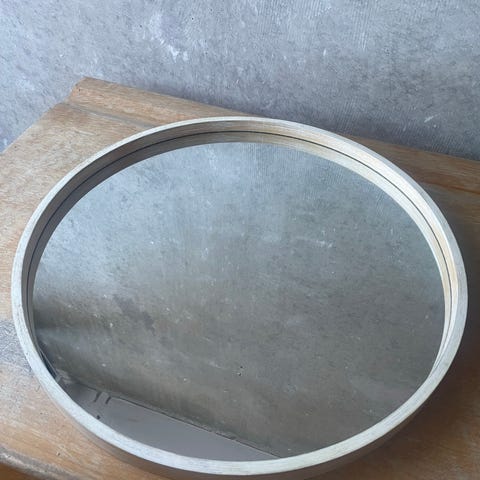 rundt spejl med træramme. Spejlet har en cirkulær form med en kant i trælook, som indrammer spejlfladen. Egnet til ophæng i fx stue, entre eller soveværelse som vægspejl eller dekorativt element. Ny pris 700