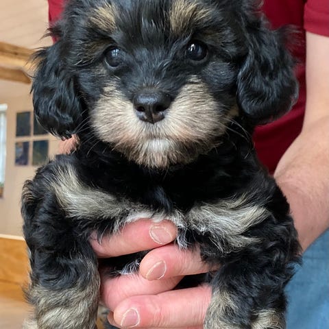 Hun er en blanding mellem mor Bichon Havanais (hvid) og far maltipoo (lysebrun). Hun vil komme til at veje mellem 4 og 6 kg.