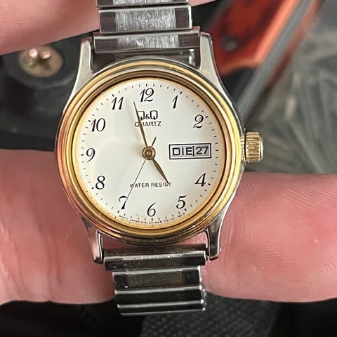 Vintage q&q quarts armbåndsur i rustfrit stål med dag og datofunktion. Water resist