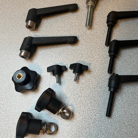 Drejegreb i træ med metalende. Grebet er formet som et rundt håndtag, der smalner ind mod metalenden, som har hul til montering. Længden er ca. 8 cm, som vist på billedet med tommestok. Velegnet som reservedele eller udskiftning til f.eks. værktøj, maskiner eller møbler, hvor der kræves et lille drejegreb i træ.