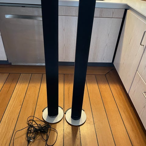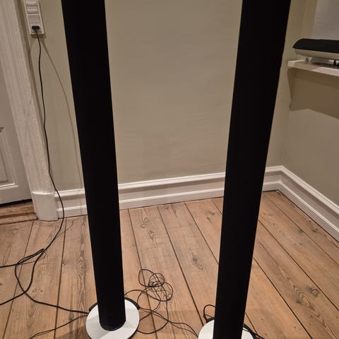 Bang & Olufsen Beolab 6000 aktive gulvhøjttalere i søjledesign. Højttalerne står på runde fodplader og har sort kabinet med lys fod og lys bag. Egner sig til brug i stue eller andre opholdsrum som del af et Bang & Olufsen-lydsystem.
