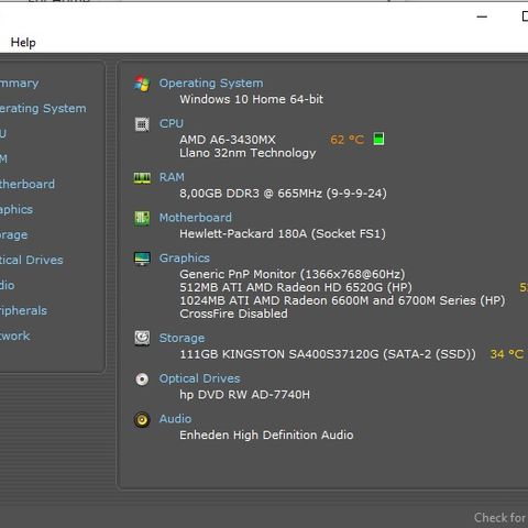 HP Pavilion Dv8, i7 Q720 (1.6 GHz) GHz, 8GB GB ram, 500GB GB harddisk, God, God bærbar der virker som den skal, stor batteri, med oplader. Kan være også perfekt som stationær som Bærbar Computer. Nogle Taster driller lidt, U/oplader, men det kan vi trækkes lidt for.