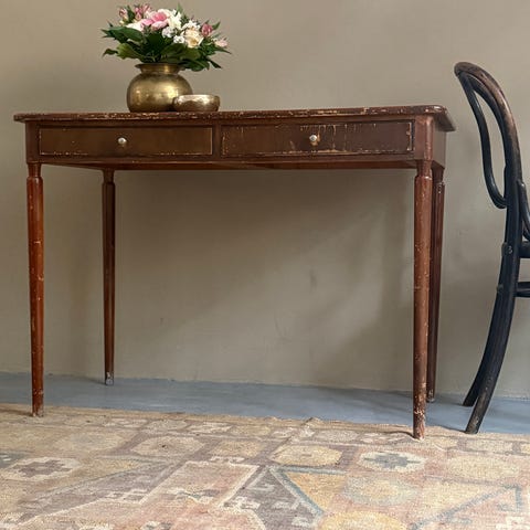 Det er blevet bejset i en flot, mørk brun, svagt rødlig tone og derefter lakeret.