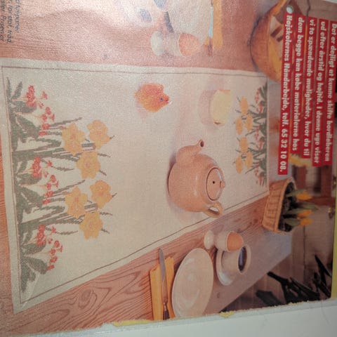 Oehlenschläger påskeløber i bomuld. Løberen er hvid med broderet motiv af kyllinger og påsketema langs kanterne. Mål ca. 25 x 72 cm. Velegnet som dekoration på bord eller kommode i påskeperioden, samtmotiver til æggevarmere og lille serviet til kurv.