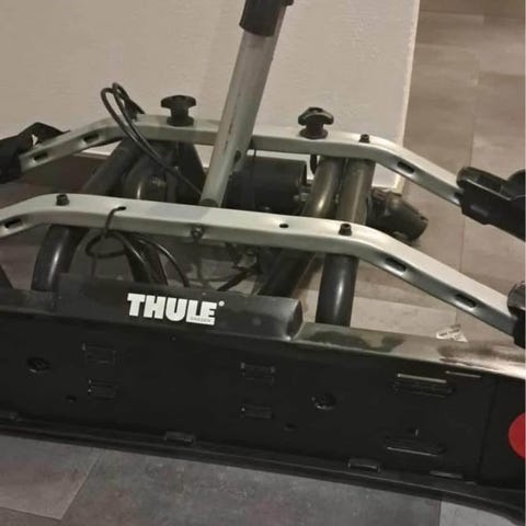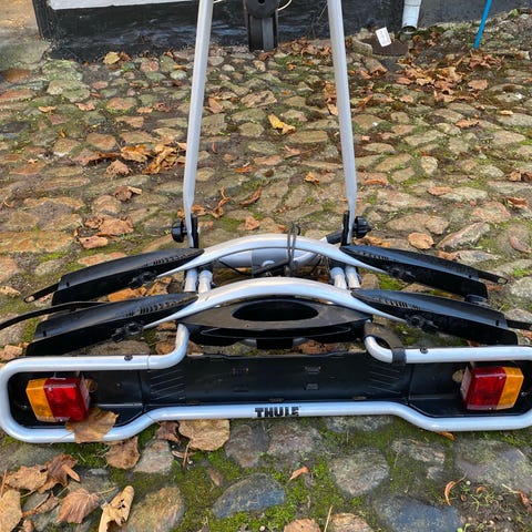 Thule dobbelt cykelholder til anhængertræk med integreret lygtebom og plads til nummerplade. Holderen monteres på bilens anhængertræk og har rammeholdere med justerbare kæber til fastgørelse af cyklernes stel. Konstruktionen er primært i metal med plastdele omkring skinner og beslag. Egnet til transport af flere cykler på personbil eller varebil, afhængigt af bilens og holderens belastningsgrænser. Vi har brugt den til cykel og barnevognsstel. Købt for 3000kr. Sælges da nykøbte bil ikke har anhænger.
