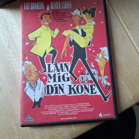 Lån mig din kone DVD film. Dansk spillefilm udgivet på DVD. Forsiden viser tegnet omslag med titel og medvirkende. Velegnet til afspilning på standard DVD-afspillere, computere med DVD-drev eller kompatible spilkonsoller, der understøtter DVD-formatet.