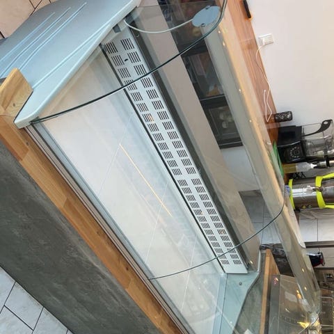 Køledisk med buet glasdisplay egnet til butik, café eller delikatesse. Enheden har stor køleflade med hylder til præsentation af madvarer. Fronten er delvist åben med glaslåger for nem adgang til varerne.